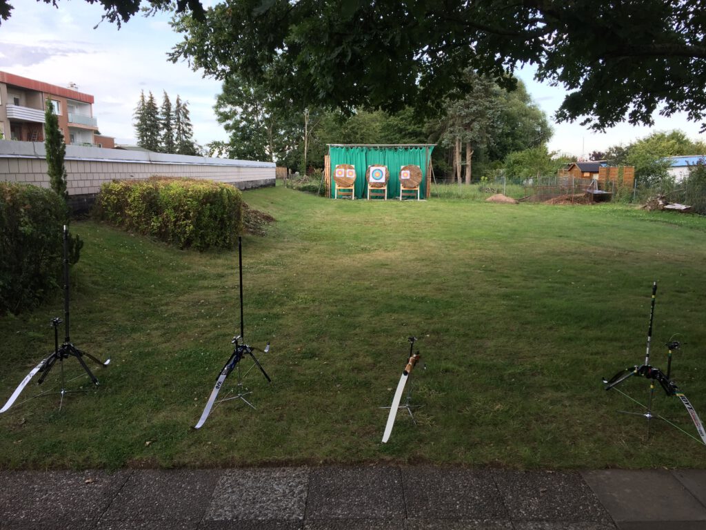 Während der Sommersaison verlagern wir unser Training in den Garten des Schützenhauses. Dort haben wir vier Scheiben aufgebaut und können so komfortabel auch mit bis zu 8 Bogenschützen gleichzeitig auf eine Entfernung von bis zu 30 Metern trainieren.
